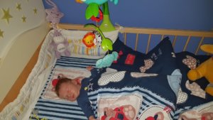 Nagypapa felszerelte a zenélő forgót a kiságyra. Mindenkinek nagyon tetszett, csak azt nem tudtuk, mit szól hozzá Botond. Azóta már jött a hír, simán elalszik a halk zenére.